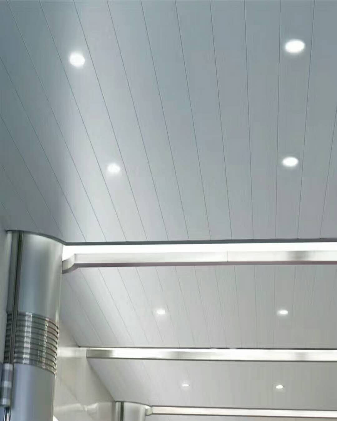 表面涂層一般粉末靜電噴涂或聚脂漆噴涂、輥涂,也可選用拉絲表面處理。呈長條形分布,棱線分明。吊頂平面因扣板和嵌條有安裝落差而呈現(xiàn)出高低交錯、立體感及動感極強的效果。