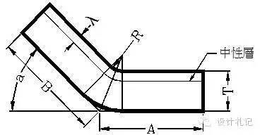 4.3 R≠0 θ=90° L=(A-T-R)+(B-T-R)+(R+λ)*π/2 當(dāng)R ≧5T時(shí) λ=T/2 1T≦ R <5T λ=T/3 0 < R <T λ=T/4 (實(shí)際展開時(shí)除使用尺寸計(jì)算方法外,也可在確定中性層位置后,通過偏移再實(shí)際測(cè)量長(zhǎng)度的方法.以下相同) | ||
