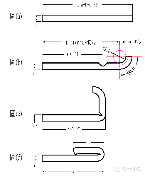 4.12卷圓壓平 圖(a): 展開長(zhǎng)度 L=A+B-0.4T 圖(b): 壓線位置尺寸 A-0.2T 圖(c): 90°折彎處尺寸為A+0.2T 圖(d): 卷圓壓平后的產(chǎn)品形狀 | ||