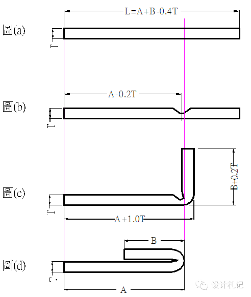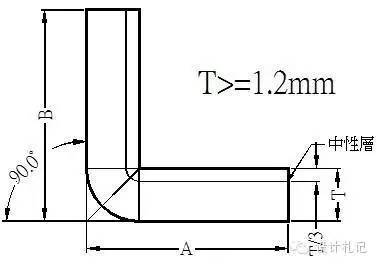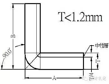 4.1 R=0,折彎角θ=90°(T<1.2,不含1.2mm) L=(A-T)+(B-T)+K =A+B-2T+0.4T 上式中取:λ=T/4 K=λ*π/2 =T/4*π/2 =0.4T | ||