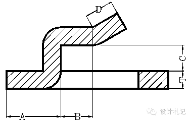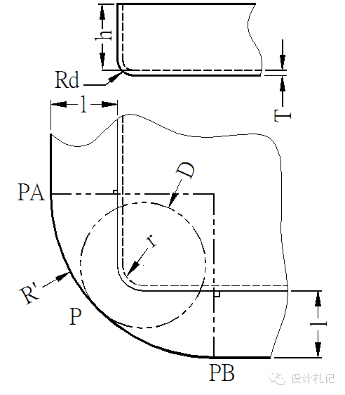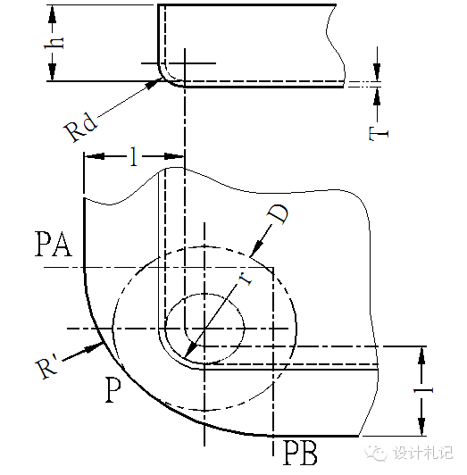 4.11壓縮抽形2 (Rd>1.5T) 原則:直邊部分按彎曲展開,圓角部分按拉伸展開,然后用三點(diǎn)切圓(PA-P-PB)的方式作一段與兩直邊和直徑為D的圓相切的圓弧. 當(dāng)Rd>1.5T時(shí): l按相應(yīng)折彎公式計(jì)算. D/2={(r+T/3)2 +2(r+T/3)*(h+T/3) -0.86*(Rd-2T/3)*[(r+T/3) +0.16*(Rd-2T/3)]}1/2 | ||