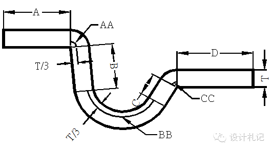 4.14 綜合計(jì)算如圖: L=料內(nèi)+料內(nèi)+補(bǔ)償量 =A+B+C+D +中性層弧長(zhǎng)(AA+BB+CC) (中性層弧長(zhǎng)均按 “中性層到板料內(nèi)側(cè)距離λ=T/3”來計(jì)算) |