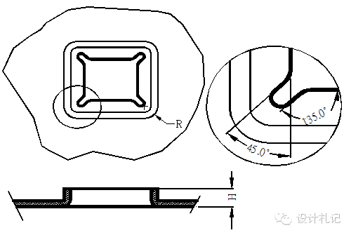 4.9 方形抽孔 方形抽孔,當(dāng)抽孔高度較高時(shí)(H>Hmax),直邊部展開與彎曲一致, 圓角處展開按保留抽高為H=Hmax的大小套彎曲公式展開,連接處用45度線及圓角均勻過渡, 當(dāng)抽孔高度不高時(shí)(H≦Hmax)直邊部展開與彎曲一致,圓角處展開保留與直邊一樣的偏移值. 以下Hmax取值原則供參考. 當(dāng)R≧4MM時(shí): 材料厚度T=1.2~1.4取Hmax =4T 材料厚度T=0.8~1.0取Hmax =5T 材料厚度T=0.7~0.8取Hmax =6T 材料厚度T≦0.6取Hmax =8T 當(dāng)R<4MM時(shí),請(qǐng)示上級(jí). | ||
