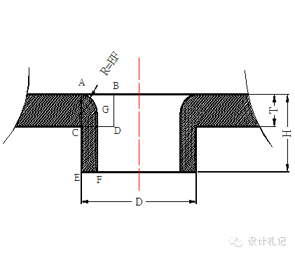 4.8 抽芽 抽芽孔尺寸計(jì)算原理為體積不變?cè)?/span>,即抽孔前后材料體積不變;ABCD四邊形面積=GFEA所圍成的面積. 一般抽孔高度不深取H=3P(P為螺紋距離),R=EF見圖 ∵ T*AB=(H -EF)*EF+π*(EF)2/4 ∴ AB={H*EF+(π/4-1)*EF2}/T ∴預(yù)沖孔孔徑=D – 2AB T≧0.8時(shí),取EF=60%T. 在料厚T<0.8時(shí),EF的取值請(qǐng)示上級(jí). | ||