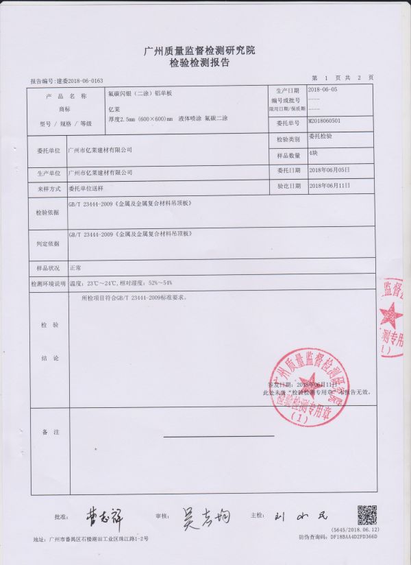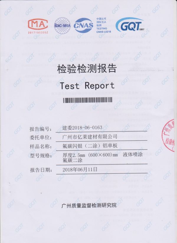 氟碳閃銀(二涂)鋁單板檢測(cè)報(bào)告